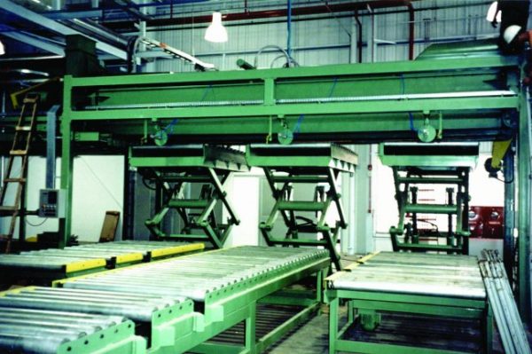 Descarregamento dos pacotes formados sobre as mesas hidráulicas por meio de rolos livres e inclinação da parte superior da mesa, ou por meio de rolos ou correntes acionados. Convergência dos pacotes para sistemas de transporte integrados.