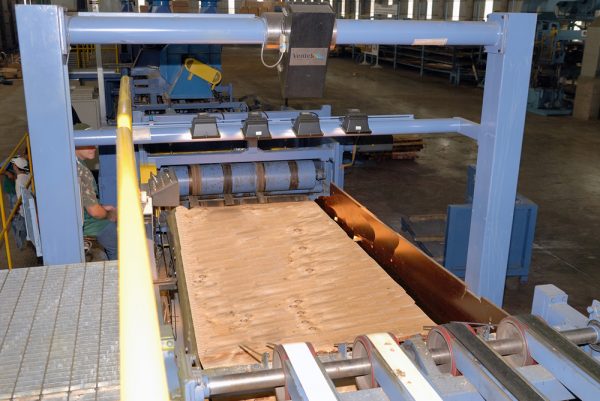 Guilhotina rotativa modelo GT, com três facas a 120 graus, acionada por motor servo elétrico, velocidade de trabalho de 60 a 150 m/min.